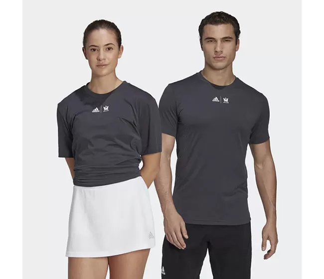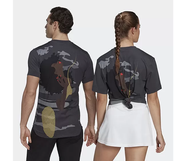 Designed in collaboration with South African fashion brand Thebe Magugu for North America’s biggest tennis tournament. On the back of this adidas tee, a bold graphic of a dancing woman exudes optimism. Created for all-action play, this top has a slim, streamlined fit, moisture-absorbing AEROREADY and breathable mesh details. This tee is made with natural and renewable materials as part of our journey to design out finite resources and help end plastic waste.