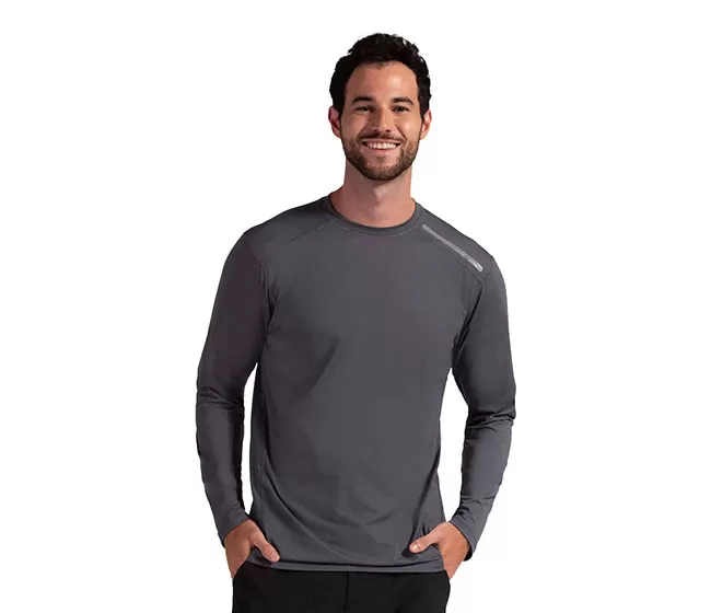 The BloqUV 50+ UPF men’s Jet Long Sleeve Tee is sun protection to be worn alone, as a base layer, swim shirt, rash guard or beach cover up. The long sleeve performance SPF tee offers comfort, freedom of movement and is perfect for running, biking, swimming, boating, skiing, tennis, golf, working out or just looking sharp at leisure.
