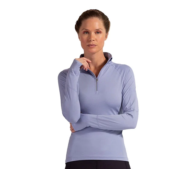 The BloqUV sun protective ladiesโ quarter zip top is a best seller for good reason. The high neck and long sleeves offer sun protection from the neck to the hands with versatility to wear on its own or layer with other pieces. Perfect over a tee or under a windbreaker or ski jacket. Enjoy SPF protection while skiing, running, walking, fishing, boating, biking, or playing tennis and golf.