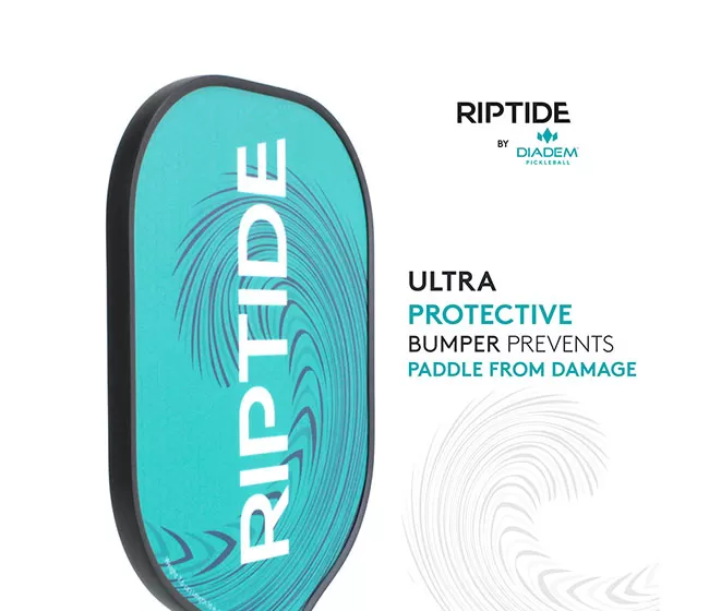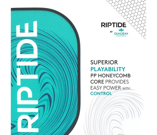 The DIADEM RIPTIDE PADDLE is the perfect option for the serious pickleball player not looking to break the bank! Perfectly balanced and easy to swing, you will be able to enjoy the game of pickleball right away. Choose between the true Diadem teal, or the electric yellow. The Diadem Riptide paddle uses HMT Fiber, a blend of hot melt glass fiber to give power to your baseline strokes and put away as well as a rough surface to get added spin. The thick bumper prevents any scratches to the paddle surface as you learn the dos and don’ts of the game. A .55in/12mm thickness with an 8mm honeycomb cell interior structure mimics Diadem’s high-end Icon paddles for added power. The next pickleball champion starts here!