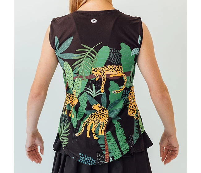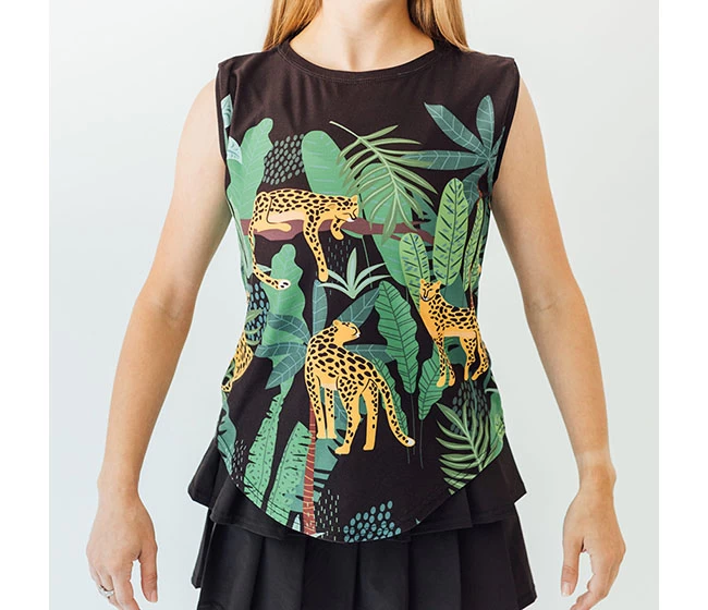 You are a Lioness on the court and you should show it off. The Black Jungle Muscle Tank is a favorite of the Spring 2022 line from Faye+Florie. Co-designed and worn by pickleball champion Anna Leigh Waters. Wear it with a matching Faye+Florie skirt or a great pair of leggings to complete your jungle vibe. Faye+Florie’s soft and comfortable moisture-wicking Muscle Tank is the perfect complement to your Faye+Florie skirt. Made with 100% polyester moisture-wicking material, this top will keep you cool and comfortable.