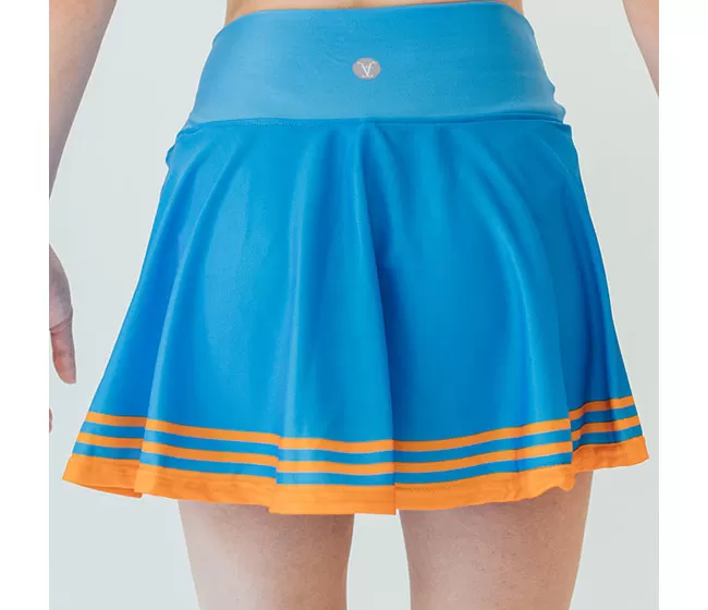 Faye+Florie nailed it with this outfit. Keeping in the jungle spirit, this Tiger Stripe Blue and Orange skirt from the waters line will pair perfectly with the Faye+Florie Blue Tiger Muscle Tank. The Holly Skirt is an elegant and polished way to gracefully move around the court. This style looks great on every body type and has a beautiful draping over hips and butt.