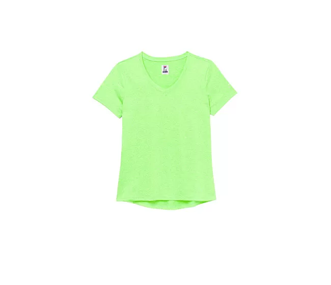 The FILA Pickleball Heathered Short Sleeve V-Neck Tee offers a comfortable fit and sun protection making it great for the courts or casual wear. It also features a rounded, elongated back hem for added coverage and an F-box logo at left sleeve.