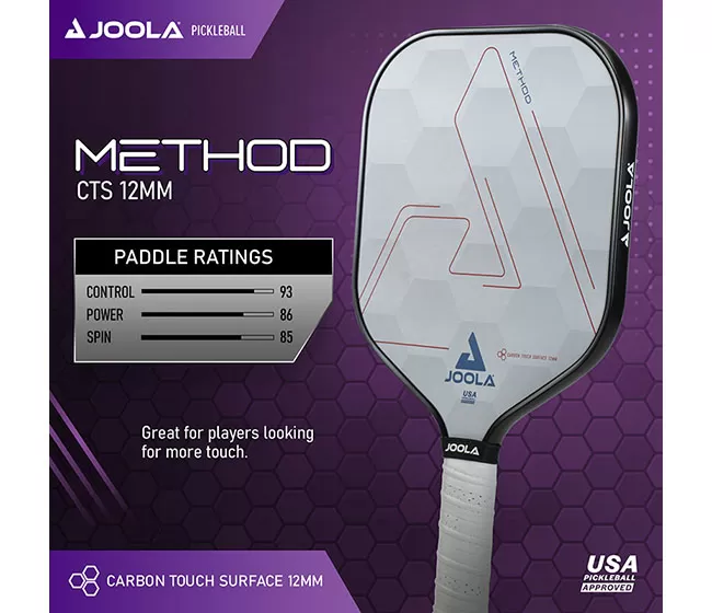 With a wider hitting area and Larger Sweet Spot, the Joola Method CTS 12mm Pickleball paddle is for the pickleball player looking for more touch. Featuring a Carbon Touch Surface (CTS), a preferred choice for the player wanting maximum control and touch, by reducing the amount of friction coming off your paddle. The Response Honeycomb Polymer Core provides reduced vibration and a generous sweet spot with amazing feedback, feel, and control necessary for dinks, blocks, and drives.