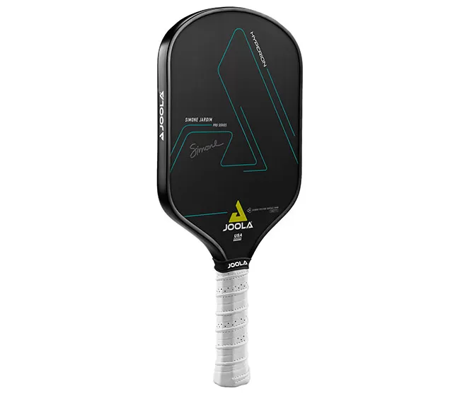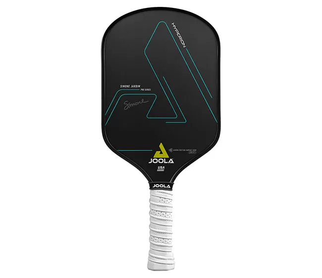 Signature paddle of pickleball legend Simone Jardim, the JOOLA Simone Jardim Hyperion CFS 14 Swift Pickleball Paddle delivers championship performance in a fast-swinging profile. This paddle features JOOLA’s new Swift Technology which gives the paddle enhanced speed through the air allowing for quick hands at the net and plenty of acceleration through drives. Like the other paddles in the Hyperion line, this signature paddle features a Carbon Friction Surface (CFS), Hyperfoam Edgewall, and a Reactive Polymer Core for a superior blend of spin, power, and feel, with consistent edge-to-edge performance. The Simone Jardim Hyperion CFS 16 Swift weighs approximately a half ounce less than the regular Hyperion CFS 16 paddle series. USAPA approved for competition. Features a Simone Jardim signature embellishment for added style.