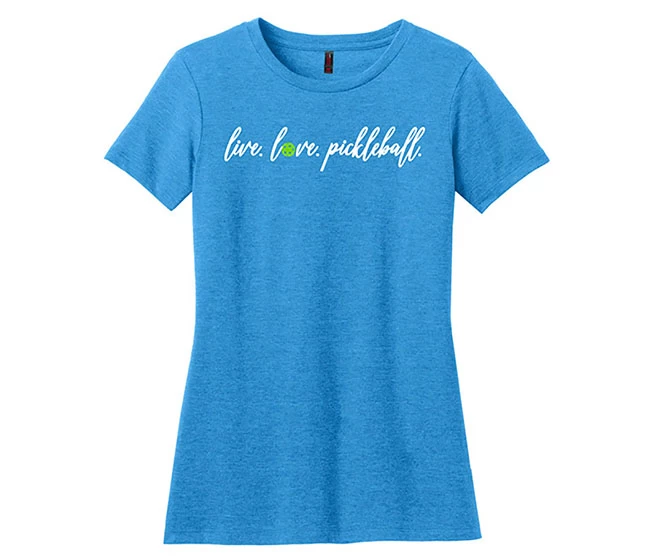 It’s important to feel comfortable and this soft tee delivers. Features 50/50 ring spun combed cotton/poly blend, 1×1 rib knit neck, tear-away label and shoulder to shoulder taping. “Live, Love, Pickleball” screened graphic on the front.(COLOR-Heathered Bright Turquoise)
