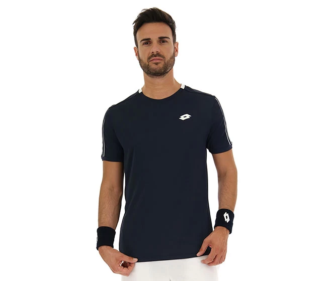 Step up your game in this Lotto Squadra II Tee. This men’s crew features a two-color crew neck, contrast stripe details at sleeves, moisture wicking fabric, and a Lotto logo at left chest.