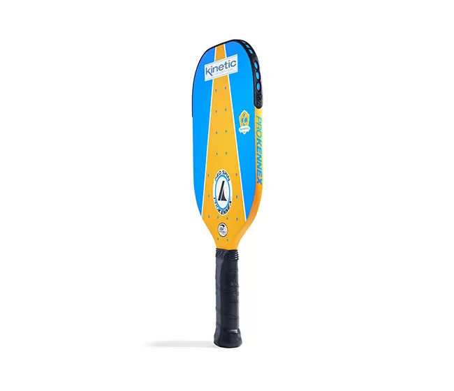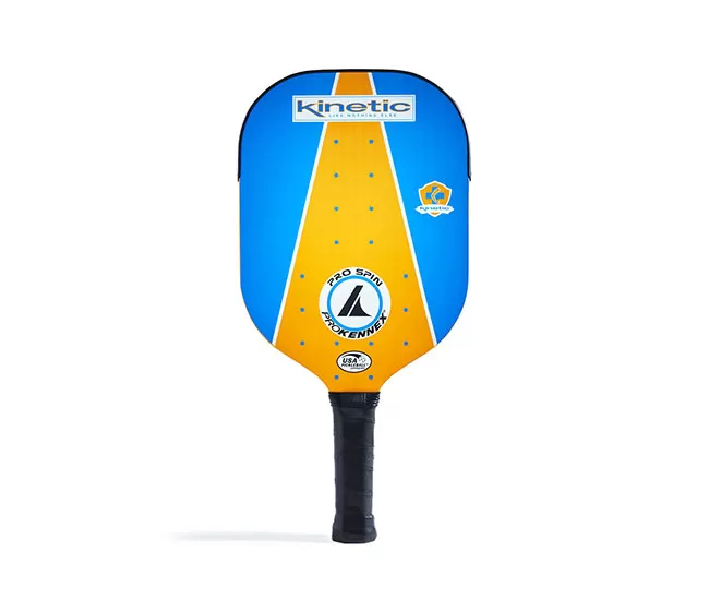 The ProKennex three-prong approach to accessing spin allows players to activate ball rotation from the textured surface and non-slip applicant in their short game while engaging the strings during groundstrokes, serves and returns for maximum spin. The Pro Spin is a brilliantly designed single-piece paddle with a graphite inlay, making it virtually indestructible. As with every ProKennex paddle, the Kinetic system reduces shock by 46% and vibration by 23%, helping eliminate the epidemic of arm injury and strain in Pickleball.
