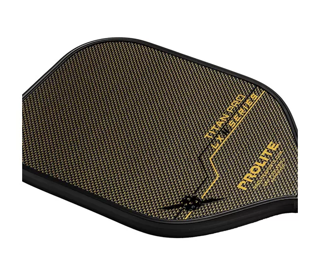 The Titan Pro LX is designed for the pickleball player looking for a very balanced paddle with ultimate control and feel in every shot. The Hyperweave Carbon Fiber utilizes a tighter cross weave interwoven with gold or silver fibers increasing uniform strength, speed, and consistency in each shot. Because it is constructed of a total of 3 layers of carbon fiber surrounding each side of the paddle core, it results in an overall 14 mm thickness improving feel, durability, and increased vibration dampening qualities. PROLITE’s flagship 14 mm core thickness provides the optimum balance of feel and vibration absorption without sacrificing power like most thicker cored paddles. Custom designed hybrid end cap that brings the tennis and pickleball worlds together. Exclusive edge guard with the Aero Channel running the length of the paddle face. The channel allows air flow through the depression of the edge creating less drag.