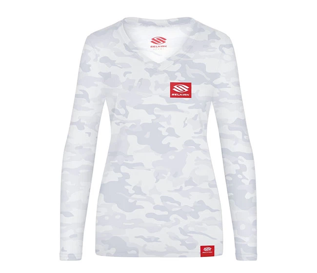 Selkirk’s Red Label Camo collection is one of Selkirk Pickleball’s most subtle and classic looks. With a modern camo and a small box logo on the chest, you know you will always look classy. This long-sleeve women’s pickleball tee features Selkirk’s exclusive Stretch-Wik fabric. It gives you ultimate comfort with its soft feel and extreme maneuverability on the court with its 4-way stretch. Fabric content is 95% polyester and 5% Spandex.